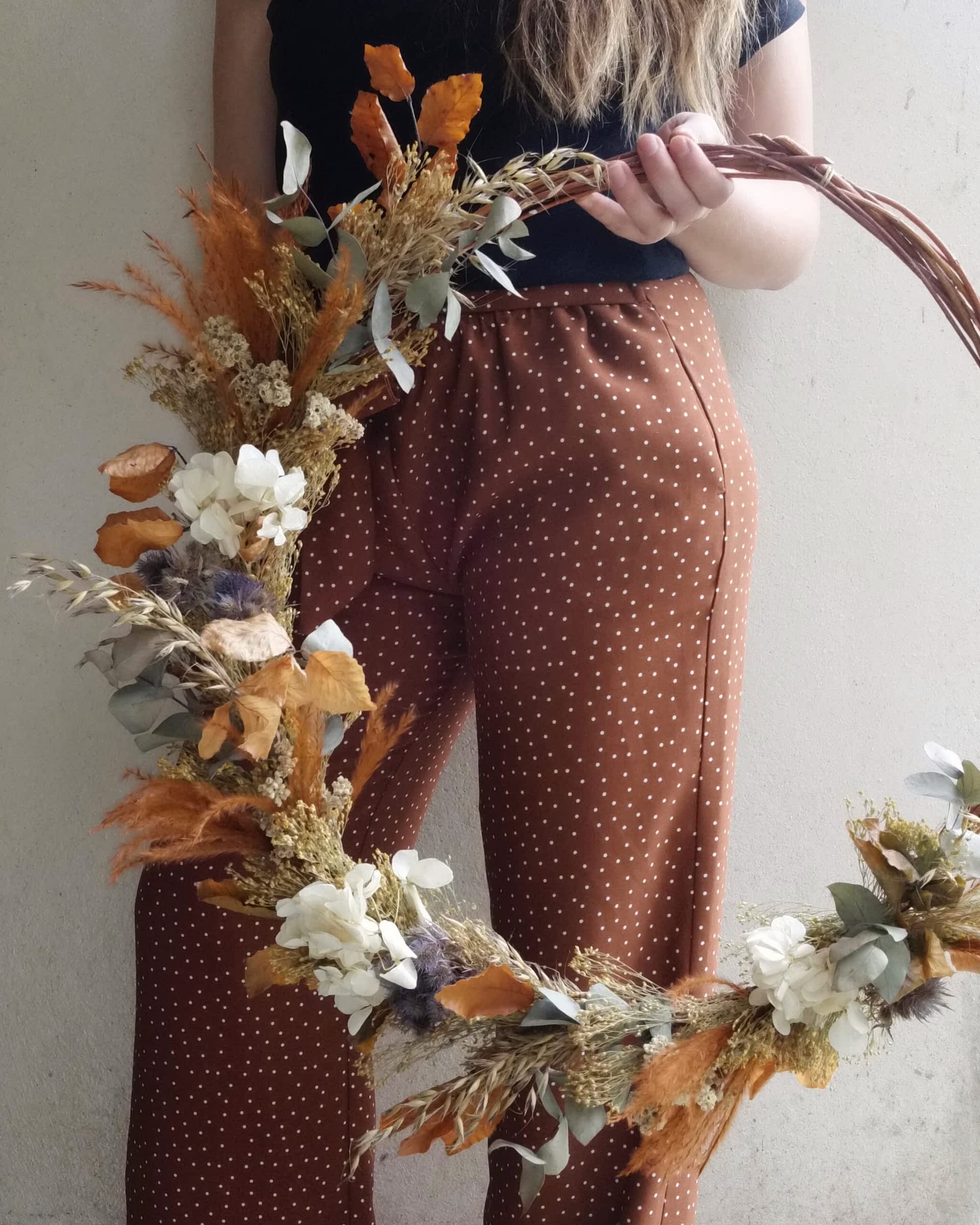 Montée sur une base en bois tressée à la main, cette couronne en fleurs séchées offre un rendu organique et chaleureux.